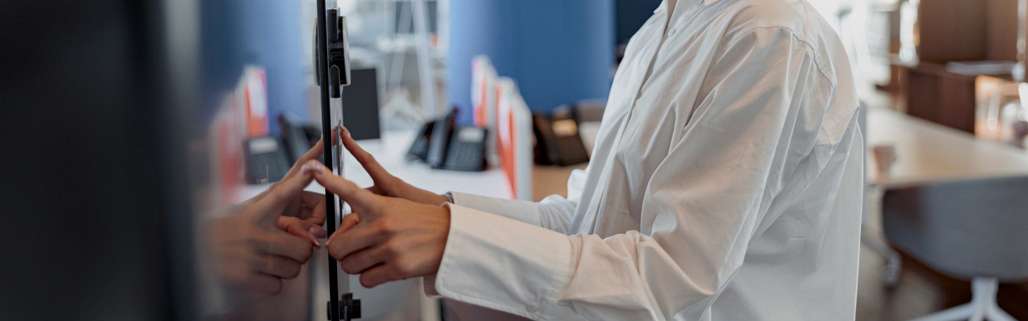 Mujer ingresando contraseña o código PIN para desbloquear y acceder a la puerta de seguridad en la oficina, instalado y configurado por Cran Mantenimientos, Instalaciones y Soluciones Integrales.